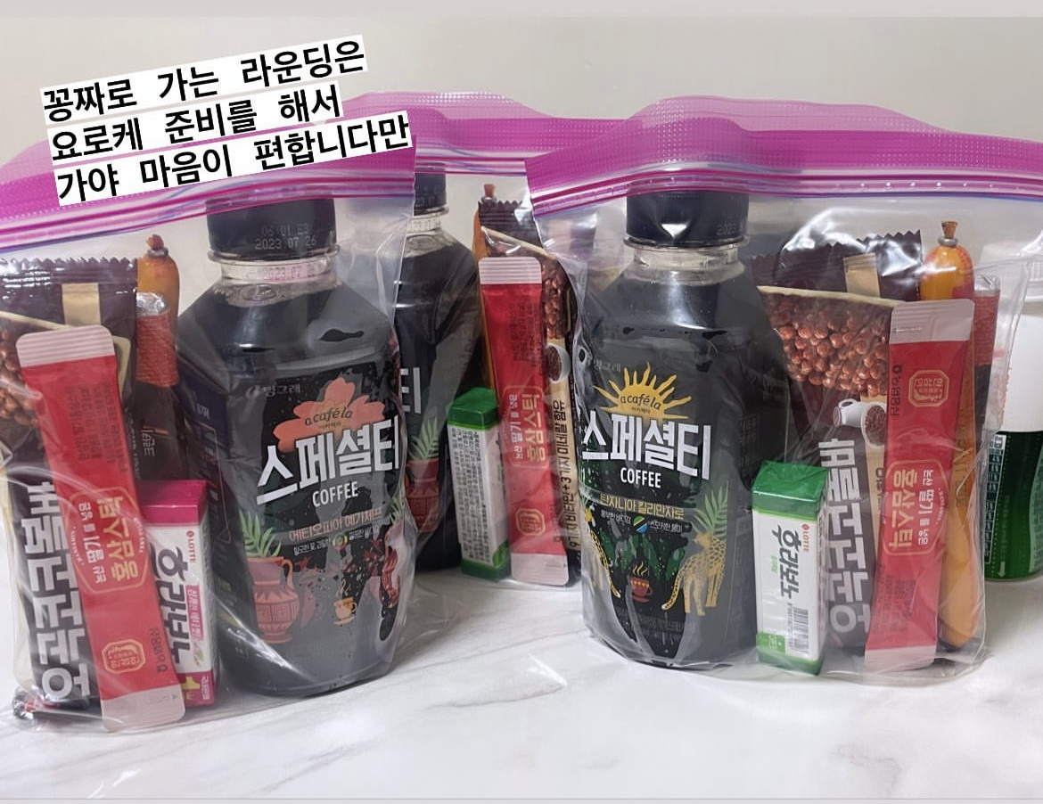 저 같은 경우는 첫 라운드는 아니었지만 아래 사진과 같이 간식이랑 커피를 투명 비닐팩에 준비해서 가서 동반자들이랑 캐디 님 거 까지 나눠드렸어요. 근처 편의점에 가서 여러 가지 종류로 과자를 담아서 포장했습니다. 저는 주로 단백질 에너지바나 맥스봉, 라운드를 하다 보면 당이 떨어질 때가 종종 있어서 달달한 과자 위주로 챙겼어요.