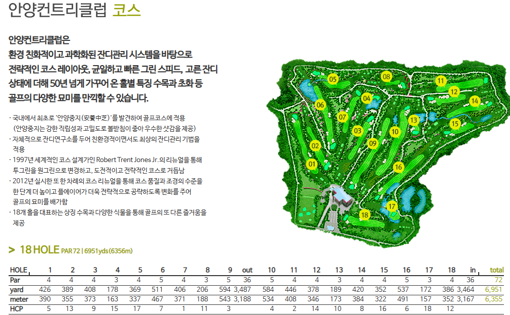 명문 골프장, 삼성 골프장으로 이미 유명한 골프장입니다. 안양 CC는 코스 관리에서 1위를 얻은 만큼 골프를 치는 사람들에게 한 번쯤은 꼭 와보고 싶은 마음이 드는 명문 골프장으로 유명합니다. 우리나라를 대표하고 일본은 물론 서구에 있는 명문 골프장에도 견줄 수 있는 수준의 골프장을 만들고자 건설되었다고 합니다.