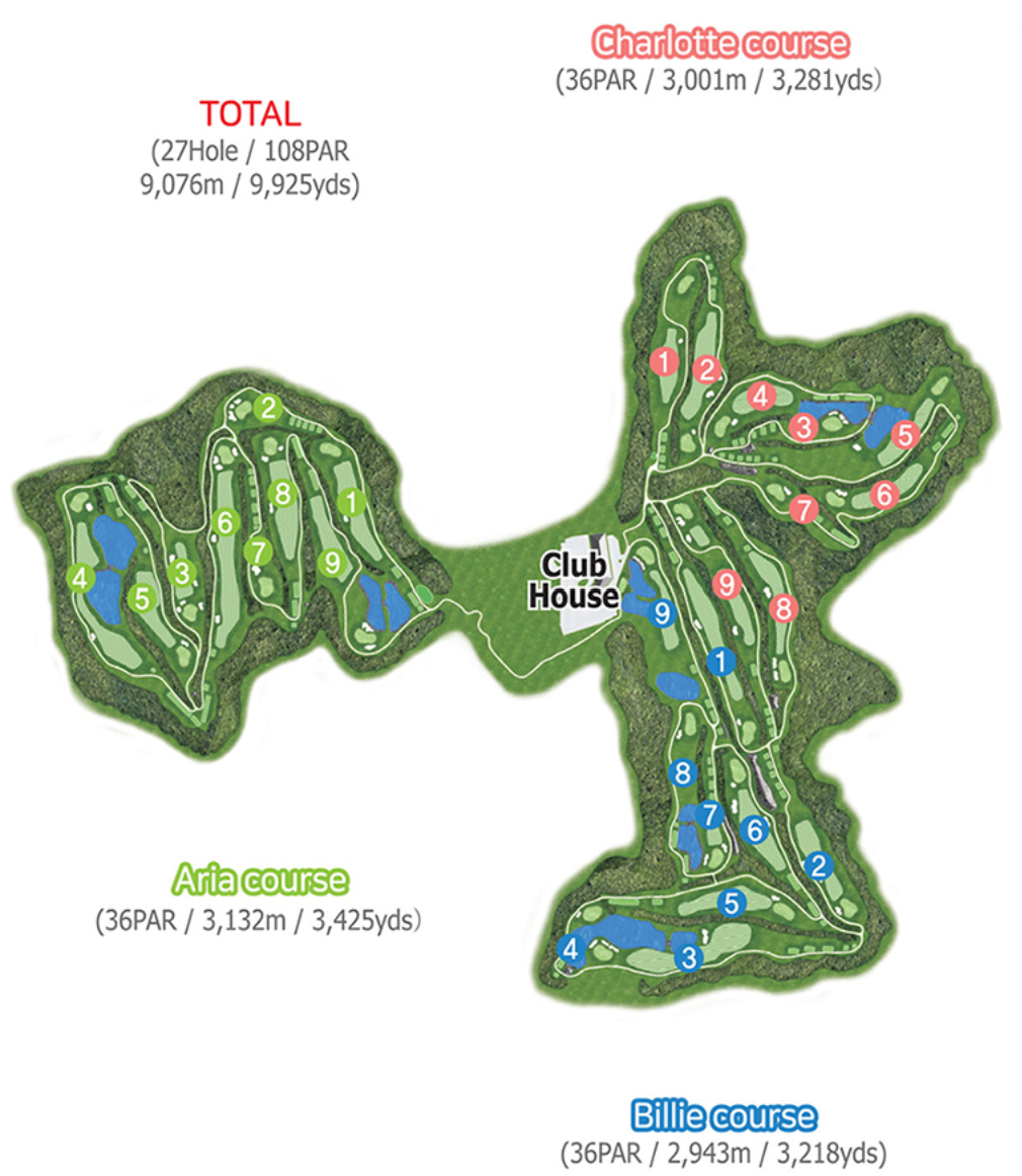 전장 총 9,076m (9,925 yds) / Charlotte 코스 3,001m(3,281 yds), Aria코스 3,132m(3,425 yds)