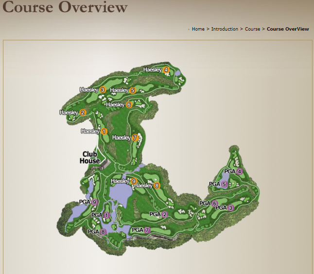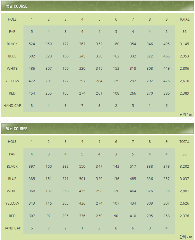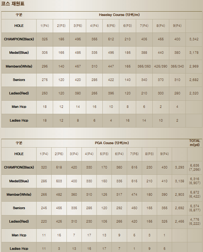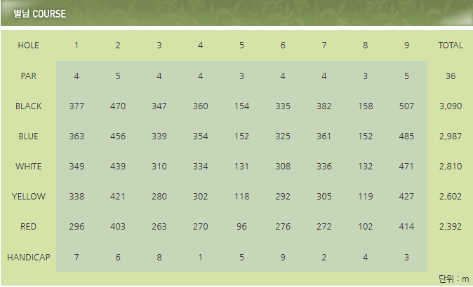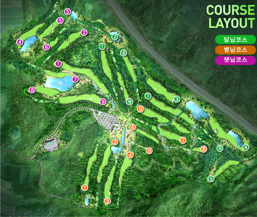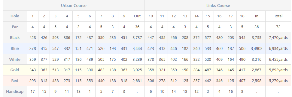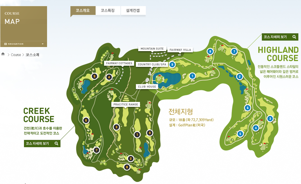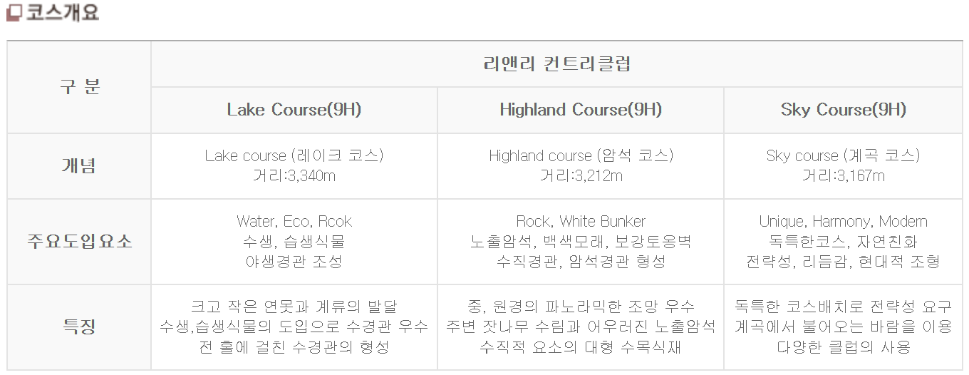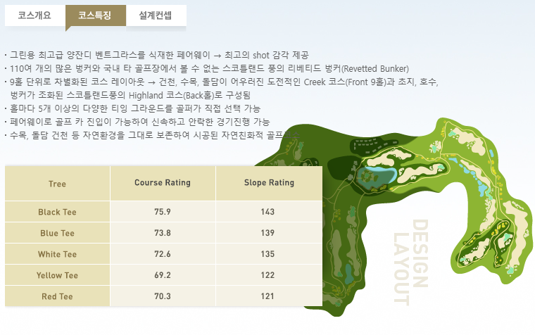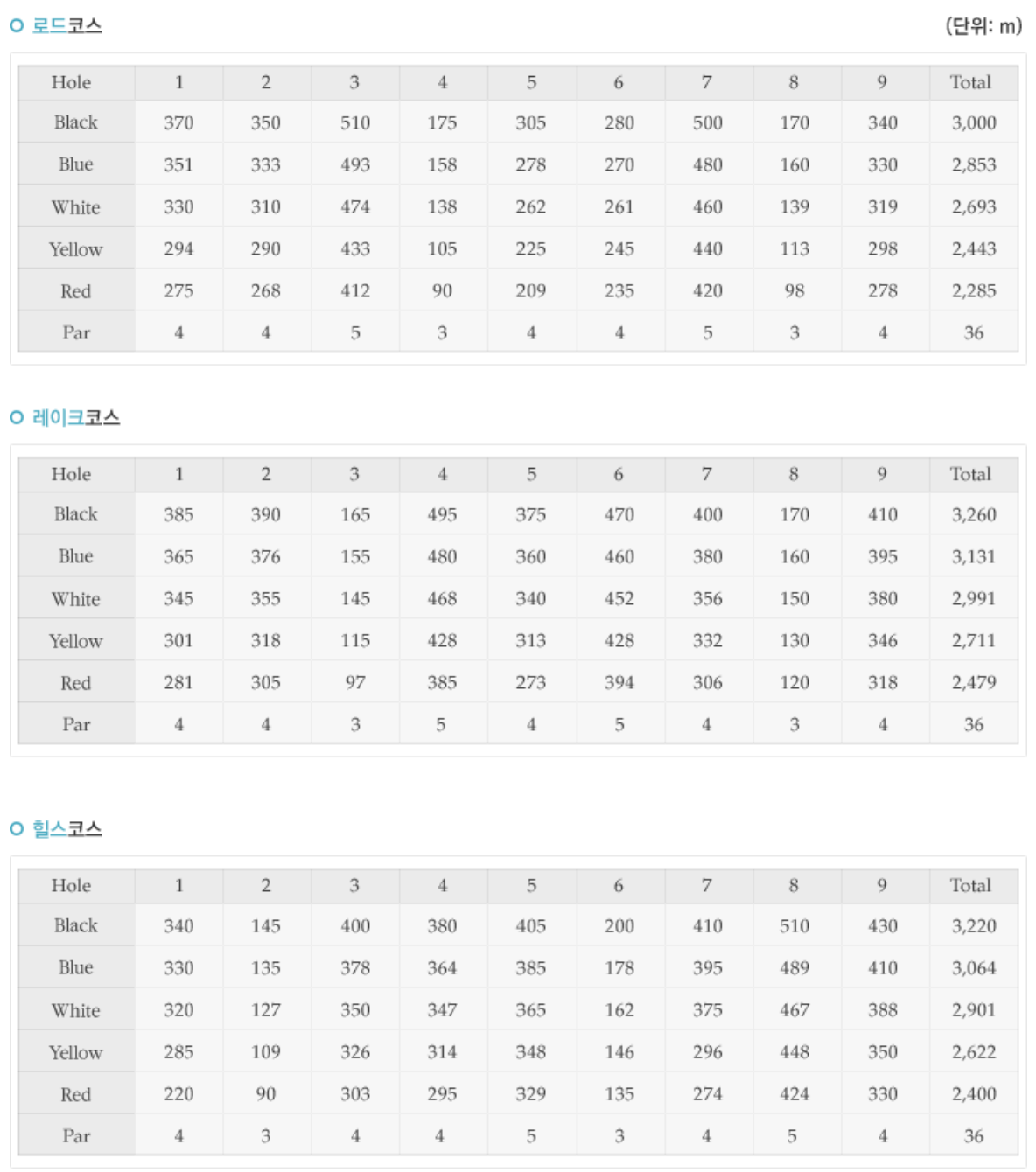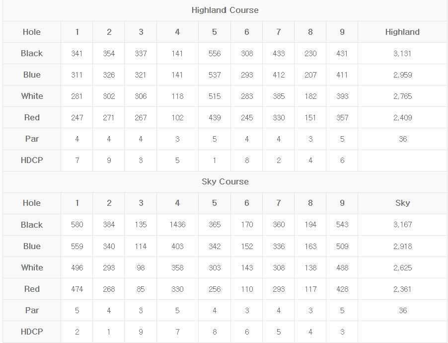 전장 레이크코스(lake) 3,340m(9H) / 암석코스(Highland) 3,212m(9H) / 스카이코스(Sky) 3,167m(계곡)