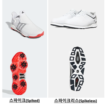 골프화는 크게 스파이크(Spiked) 골프화와스파이크리스(Spikeless) 골프화로 분류됩니다.