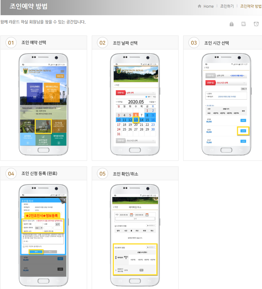 조인 예약 방법 (기장동원로얄cc홈페이지에서 가능)
