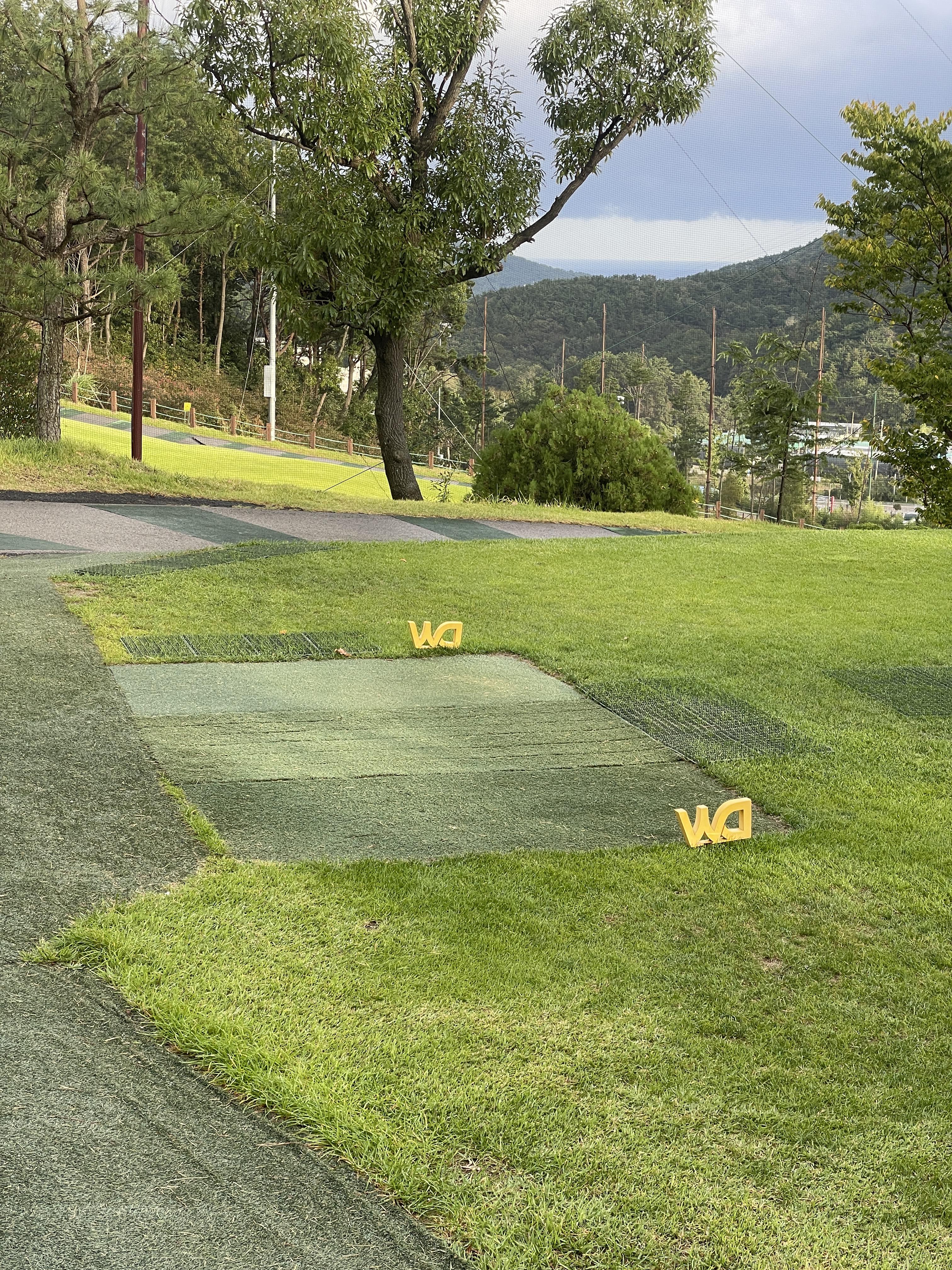 클럽하우스 1층으로 내려오면 스타트 지점에서 카트를 기다립니다. 전경으로는 산속에 구장이 있는 것 같지는 않았고 도시뷰이고, 도로들과 주택가? 와 가까운 느낌이었습니다. 그래서 차도 소리도 좀 났습니다. 도심 속 9홀 구장! 기장 동원로얄컨트리클럽에서는 기장의 앞바다가 저 멀리 보였습니다.기장동원로얄CC는 바다가 보이는 sea side구장이어서 신기했습니다.