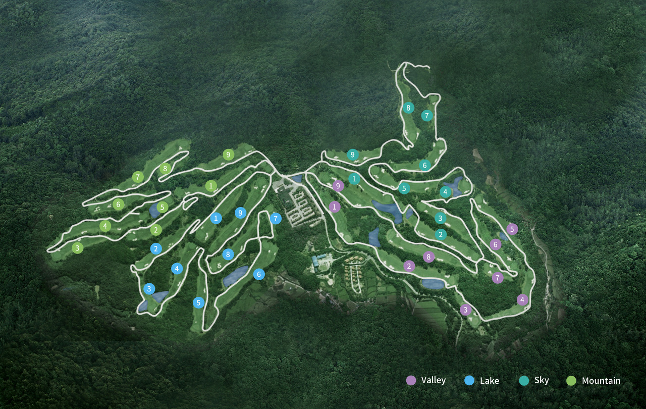 회원제인 스카이, 벨리 / 대중제인 밸리, 레이크, 마운틴 코스로 나누어져 있습니다. 회원제와 대중제로 나누어져 36홀 구성이면 꽤 큰 골프장이죠.