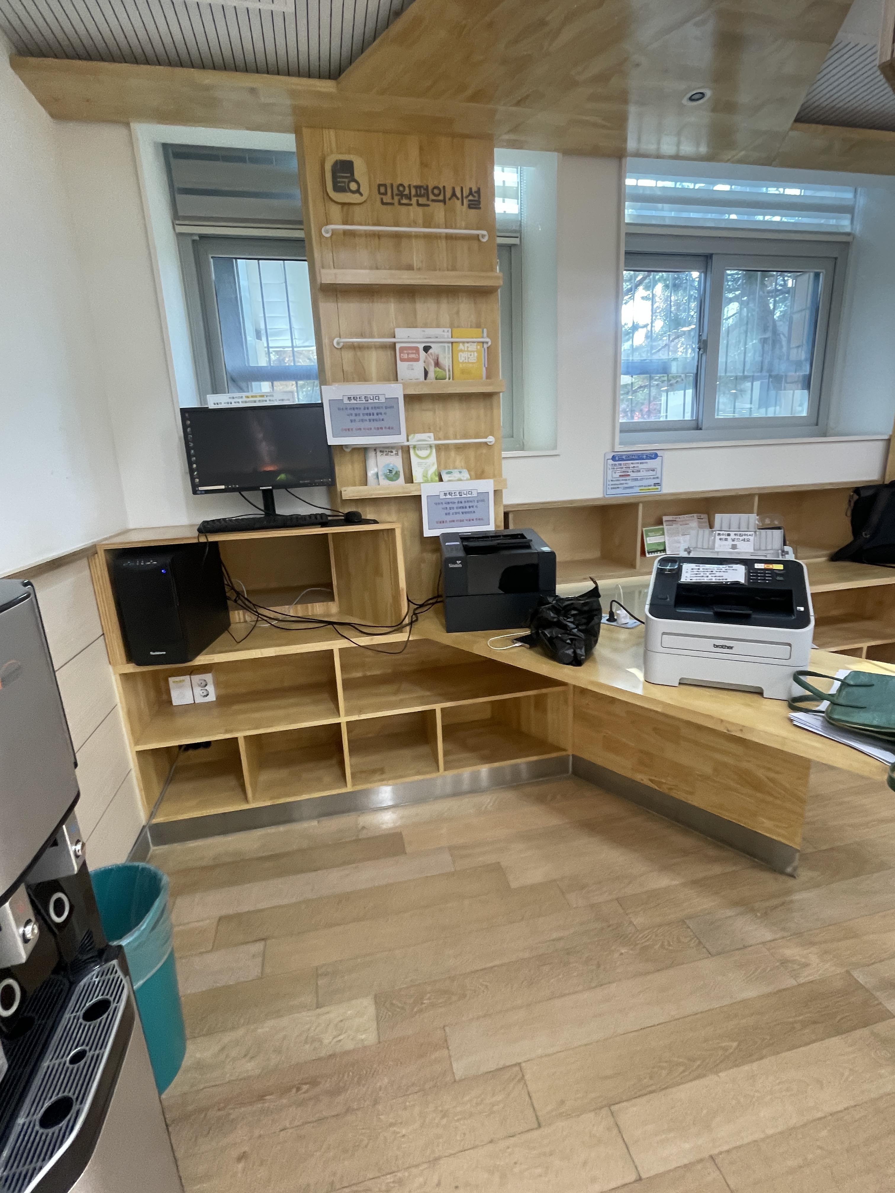 들어가자마자 민원 인포데스가 보입니다. 그러면 인포데스크를 마주보고 왼쪽으로 가면 바로 민원 편의시설이 있습니다.