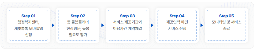 발굴 또는 직접 신청은 행정복지센터 돌봄창구 또는 새빛톡톡 모바일앱을 통해 가능합니다. 또한, 동 돌봄플래너의 현장 방문을 통해 대상자를 발굴할 수도 있습니다.
