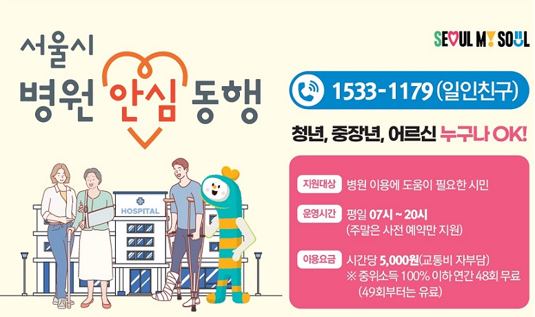 서울시 병원 안심동행 서비스'는 시민들이 병원에 방문할 때 필요한 동행 서비스입니다. 시민이 집에서 병원으로 출발할 때부터 귀가할 때까지의 전 과정에서 동행매니저가 보호자처럼 함께 동행합니다.