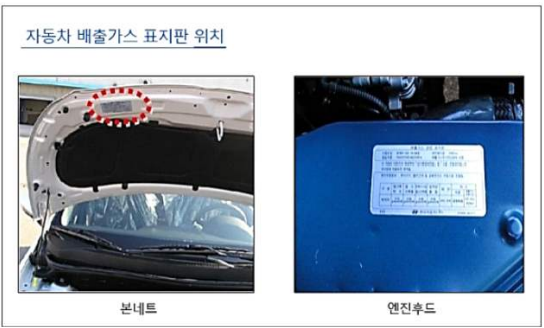 1. 차량의 본네트 안쪽 또는 후드위에 부착된「배출가스표지판」사진을 찍습니다.
