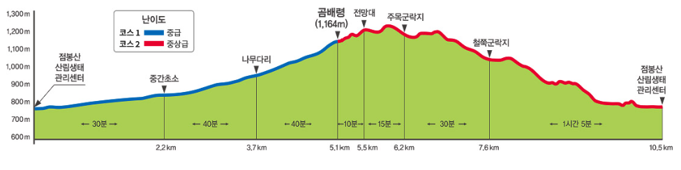 비교적 오르막과 내리막이 반복되어 중상급 코스 구간입니다. 코스 중간중간 주목군락지, 철쭉군락지를 탐방할 수 있으며, 오르막내리막 반복구간으로 안전사고 위험이 있습니다.