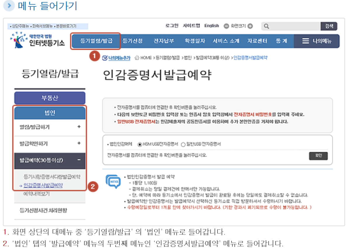(법인 인감증명서는 온라인 발급 불가능-가까운 등기소 방문하여 발급)