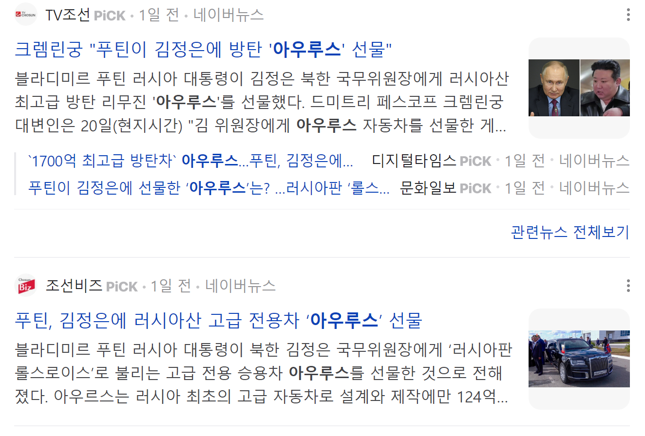 푸틴 대통령은 지난해 9월 러시아 보스토치니 우주기지에서 북러 정상회담을 했을 때 김 위원장에게 자신의 아우루스를 소개했으며 김 위원장은 직접 차량 뒷좌석에 앉아보기도 했습니다. 이는 푸틴 대통령이 자신의 아우루스를 김 위원장에게 선물로 준비했다는 것을 시사하였습니다.