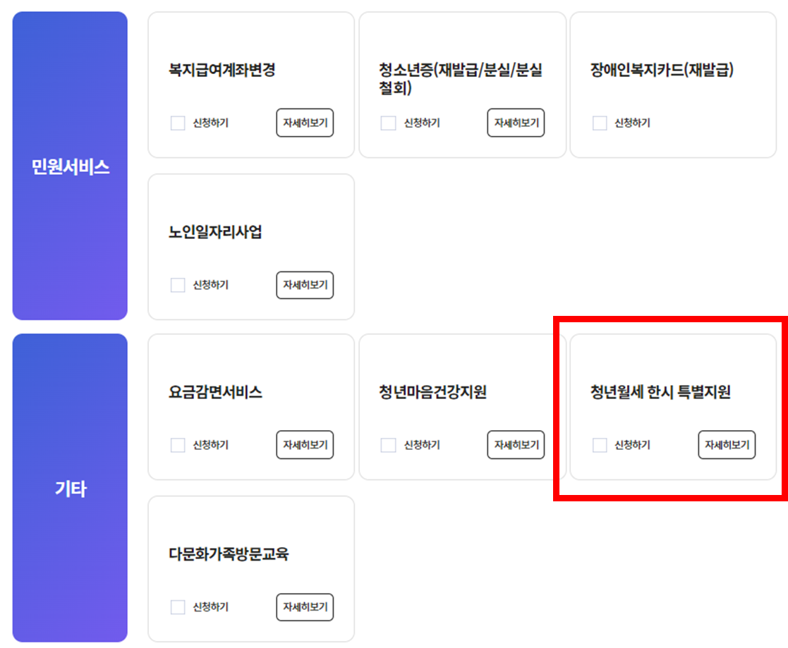 1. 기타서비스의 청년월세 한시 특별지원 신청하기 체크 후 저장 후 다음단계 선택!