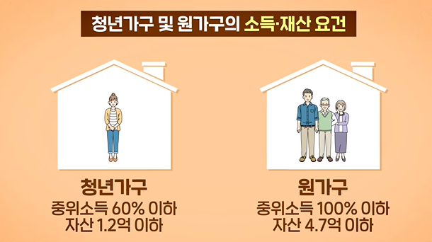 청년가구 : 기준 중위소득 60% 이하, 재한 1.22억원 이하일 경우 신청 가능함.