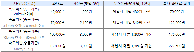 - 60km/h 초과 : 승용차 과태료 16만원, 승합차 17만원