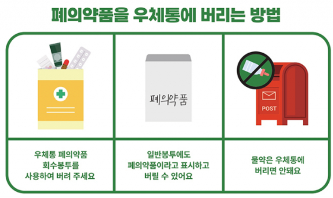 지방자치단체는 환경부, 우정사업본부, 환경재단 등과 함께 '폐의약품 바르게 버리고 바르게 회수하기'라는 협약을 체결하고, '우체통 활용 폐의약품 수거 시범사업'을 진행하고 있다. 우체통에 폐의약품을 버릴 때는 주민센터에서 배부받을 수 있는 폐의약품 전용 회수봉투나 일반 종이봉투를 사용해야 한다.