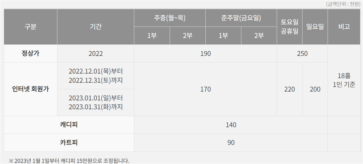 평일, 주말은 아래 그린피로 확인해주시면 됩니다. (금요일에는 웹회원 만원 할인 적용 안된다고 합니다.)