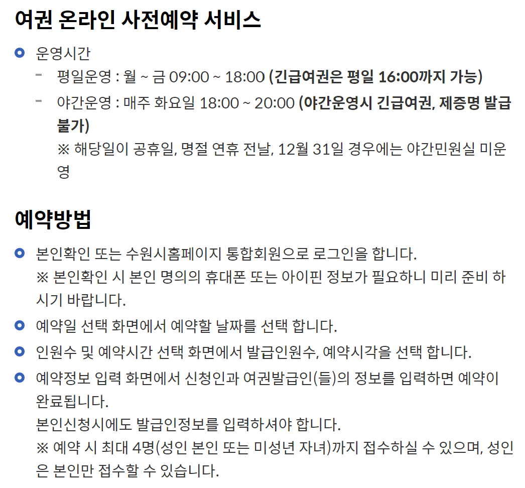 수원시 홈페이지 로그인 > 본인확인 > 예약일, 예약날짜 선택 > 인원수 및 예약시간 선택 > 예약정보 입력(신청인, 여권발급인의 정보 입력) > 접수 완료