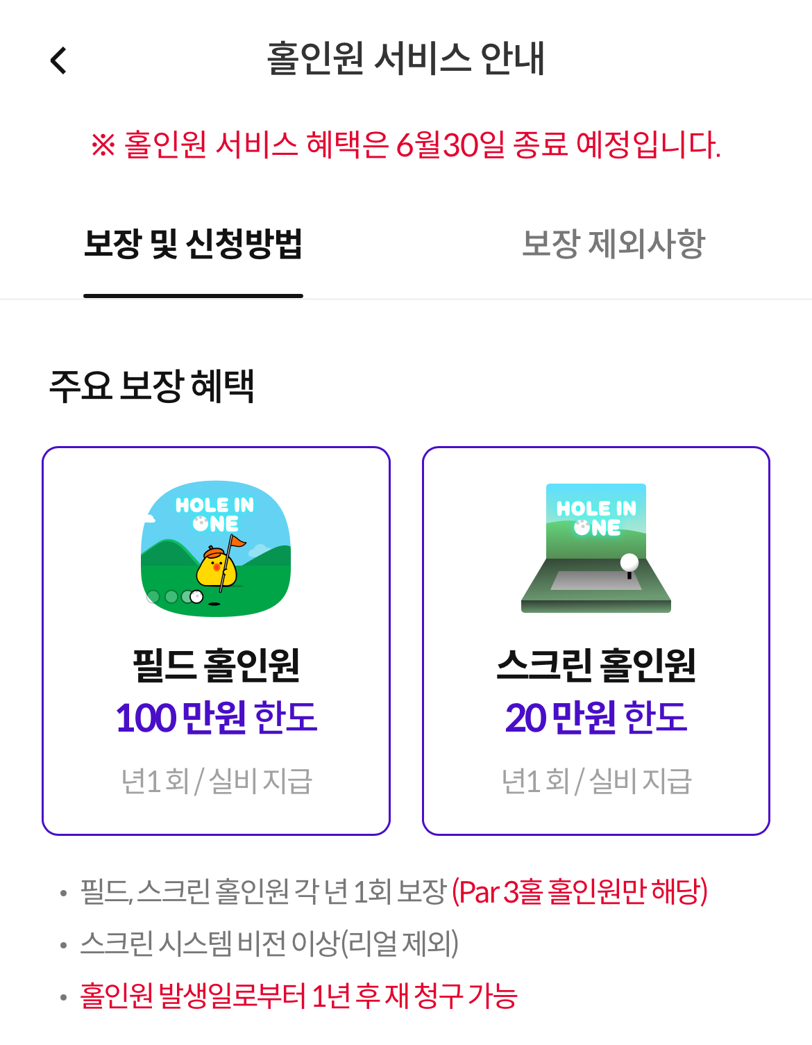 저는 이미 골프존 멤버십 회원으로 혜택을 받고 있었어요. 스크린에서 기대도 안했던 홀인원을 해버리고야 말았습니다. 스크린 20만 원, 필드 100만 원 한도 내 보상금이 있다고 해서 바로 신청을 했습니다!