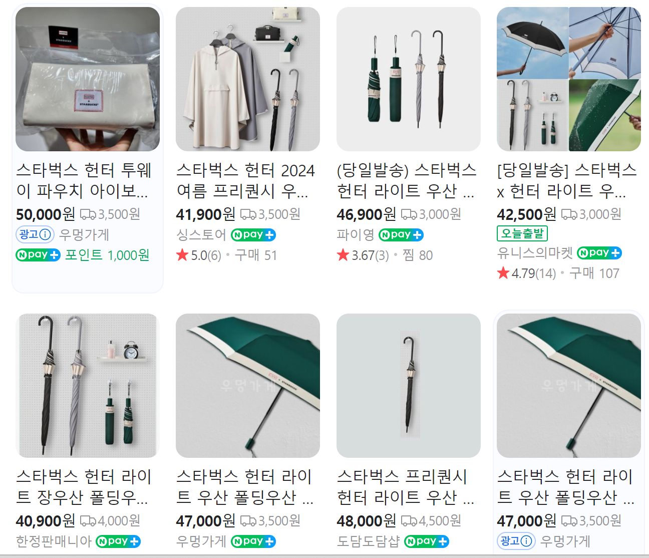 스타벅스에서 올해 제공하는 굿즈는 160년의 역사를 가진 영국의 레인부츠 브랜드 헌터와의 협업 품목인 레인판초, 우산, 파우치 등입니다. 그중에서도, 비 오는 날에 입을 수 있는 레인판초는 특히 큰 인기를 끌고 있습니다. 이러한 인기를 반영하여, 중고거래 플랫폼에서는 스티커 대신 이 굿즈를 5만~6만 원에 판매하는 글도 쉽게 찾아볼 수 있었습니다.