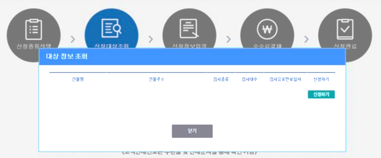 > 숫자 입력 후 나오는 검사 대상 건물과 주소지 재확인한 후 신청하기 버튼 클릭
