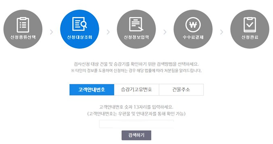 승강기민원 24 홈페이지 > 민원신청 > 승강기 검사신청 > 정기검사/정밀안전검사 > 본인인증 및 고객안내번호 입력 > 신청정보 기입 > 수수료 납부 > 완료