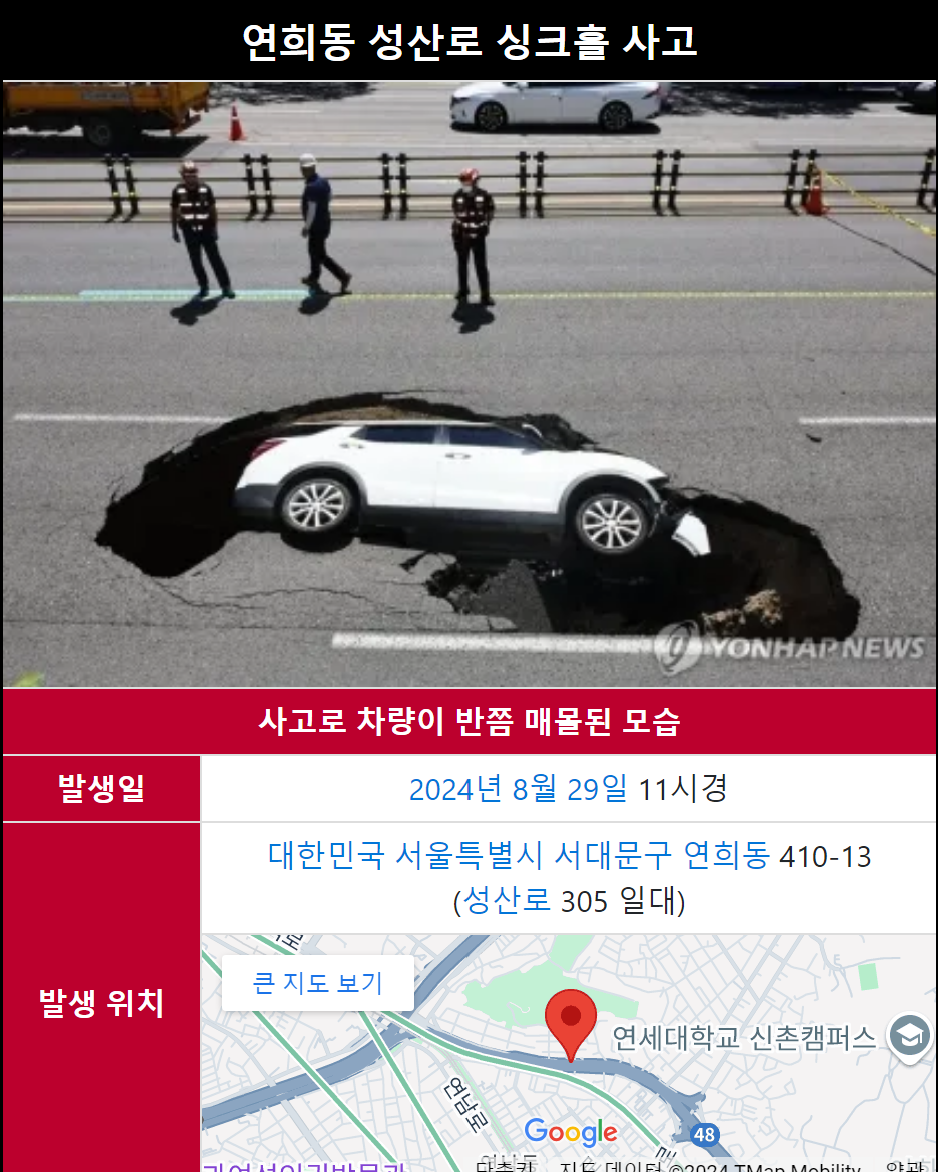 연희동은 서대문구에 속한 지역으로, 서울 시내에서도 상대적으로 오래된 주거 지역 중 하나입니다. 차량이 반쯤 매몰되어 싱크홀 안으로 차량이 매몰되는 사고가 발생했습니다.
