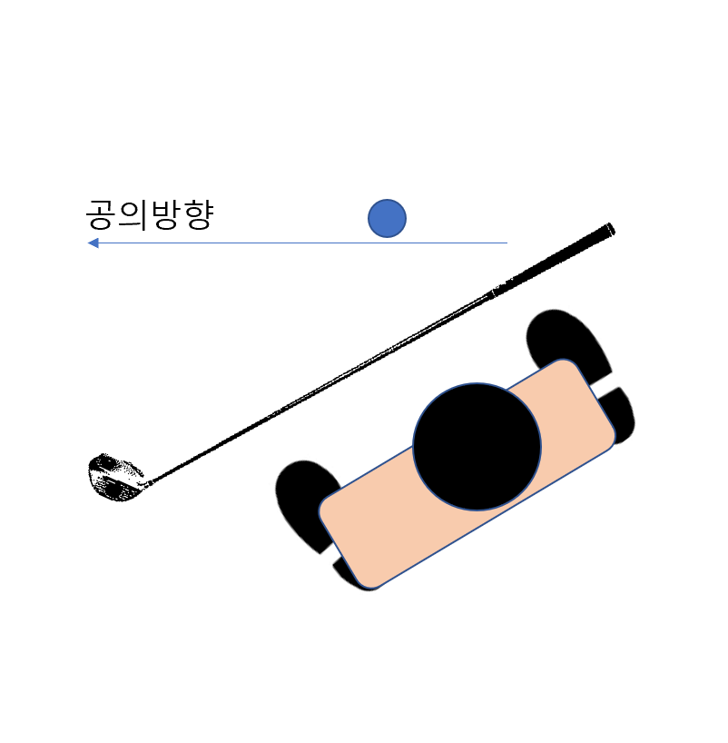 헤드의 임팩트 이후 바로 몸통회전이 되어야하는데 임팩트 속도는 빠르고, 몸통회전 타이밍이 조금만 늦춰지게 되면 치킨윙이 발생할 가능성이 큽니다. 아래의 그림과 같이 양쪽발의 각도를 45도 정도 틀어서 임팩트를 해보세요. 웬만하면 치킨윙이 나오지 않을 겁니다. 이 느낌을 가지고 계속해서 연습하시길 추천드립니다.