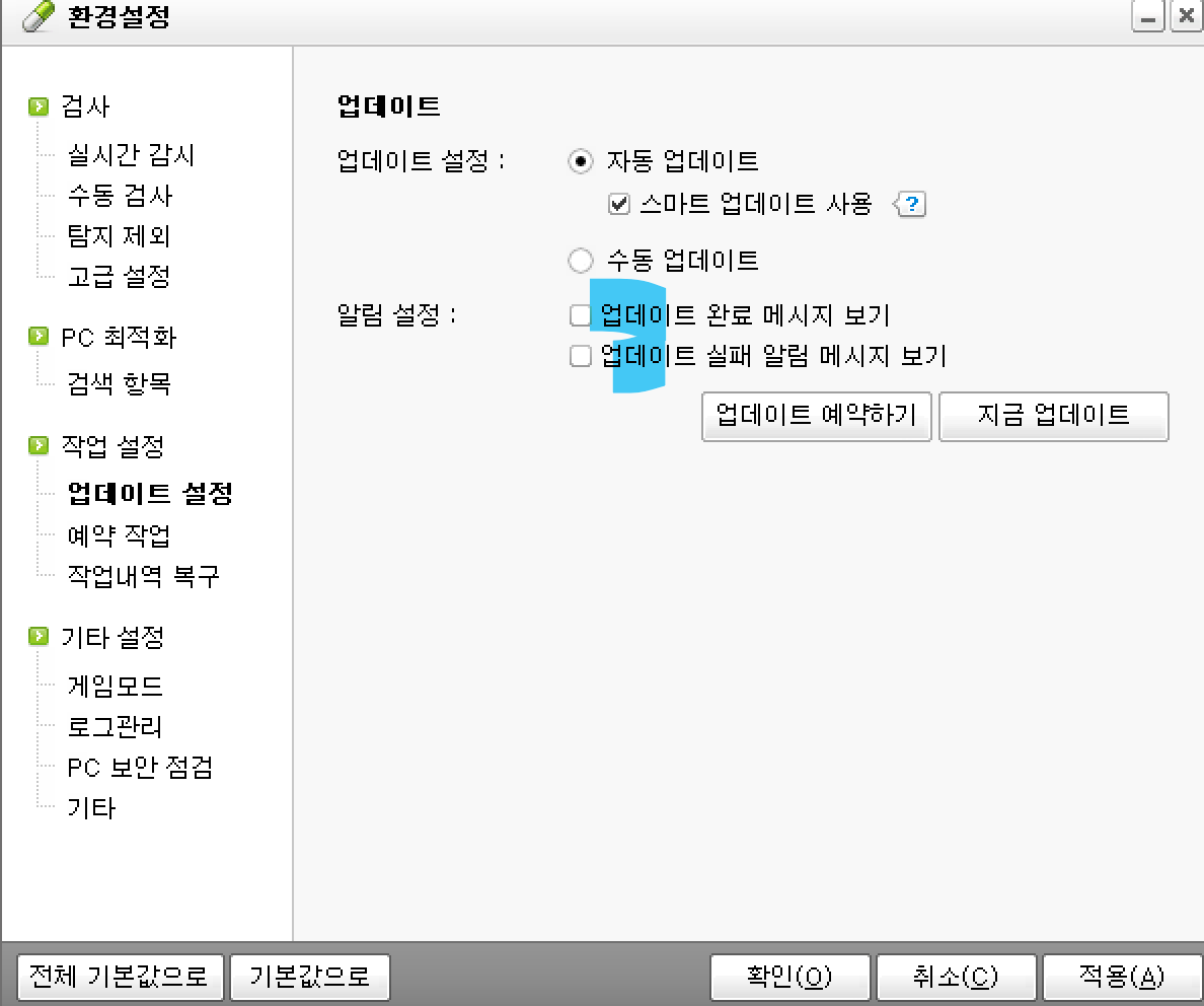 1.알약프로그램 실행 환경설정 업데이트 설정 끄기>작업설정 업데이트설정 알림 설정체크박스모두해제 적용