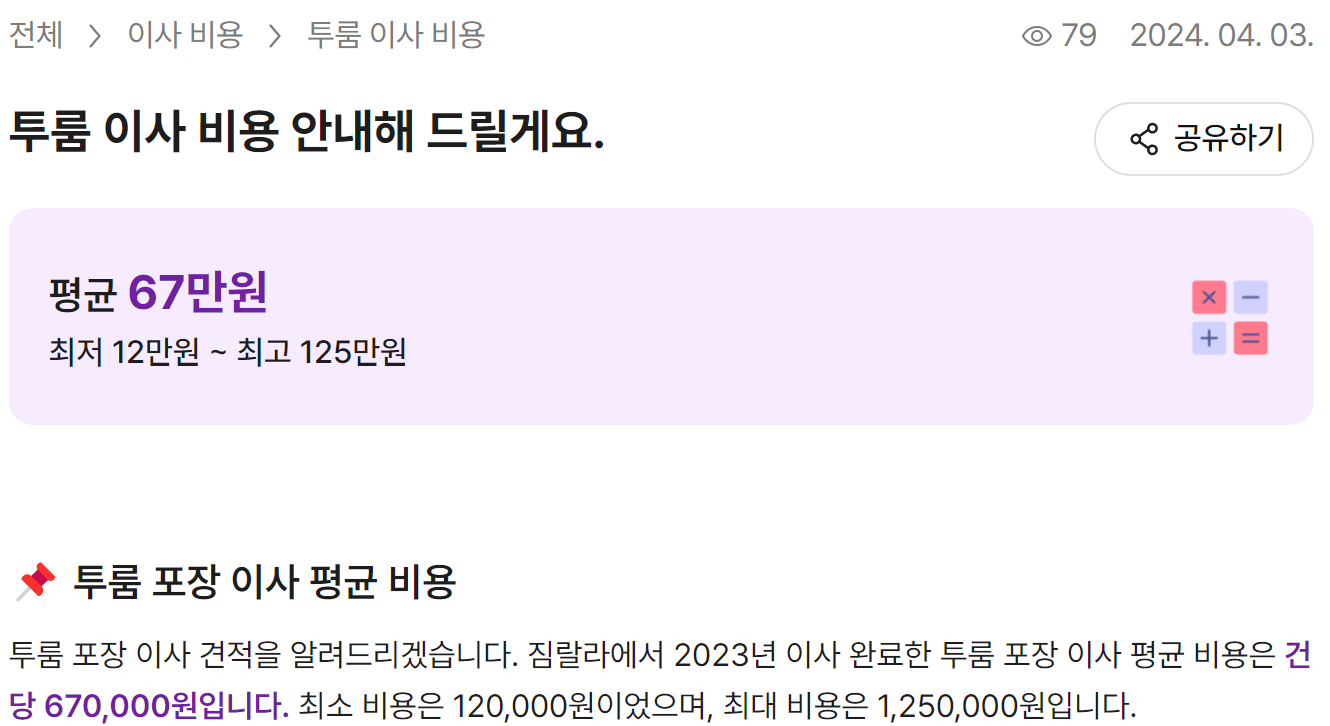 투룸 이사 비용 평균 67만원 정도 든다고 합니다. (최저 12~125만 원까지)