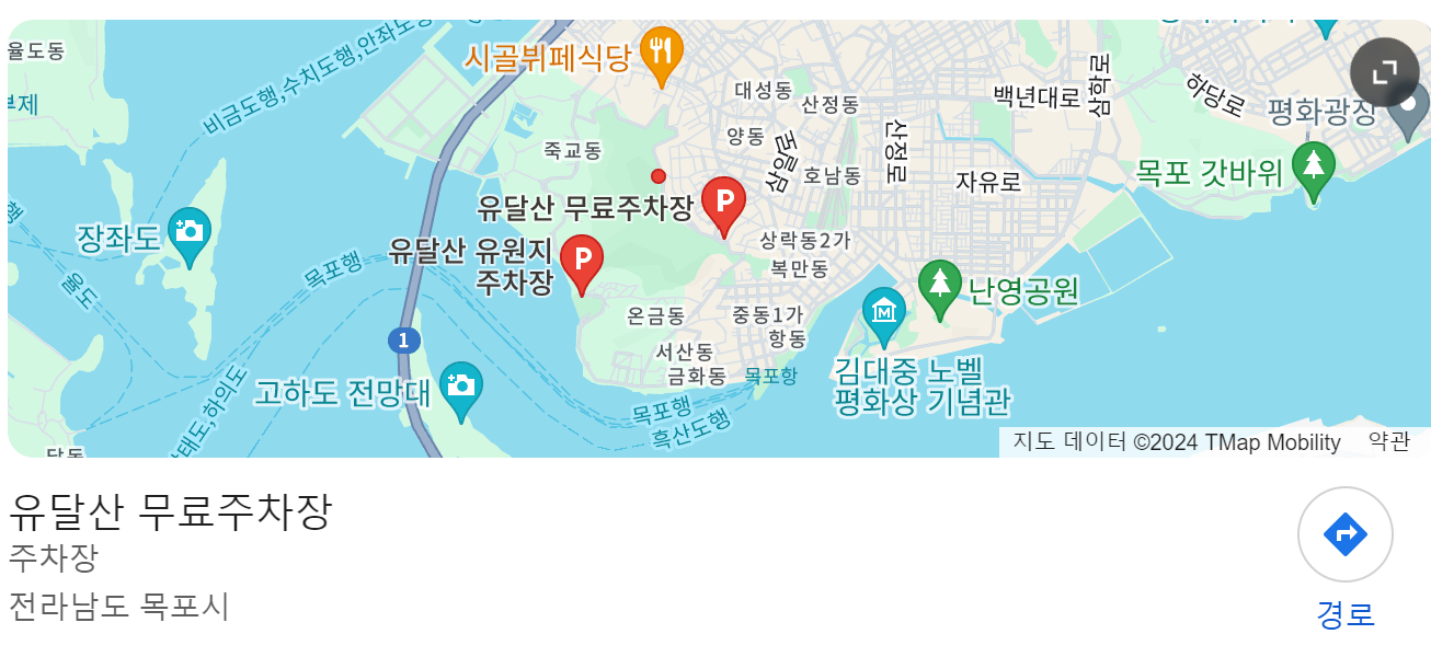 유달산 주차장은 주로 유달산 공원 입구 근처에 위치해 있습니다. 주차 공간이 있으며, 산행을 시작하기에 편리한 위치입니다. 주차장이 꽉 차는 경우도 있으니, 주말이나 공휴일에는 일찍 가는 것이 좋습니다. 또, 주변에 도로가 좁은 곳도 있으니 주의하세요!