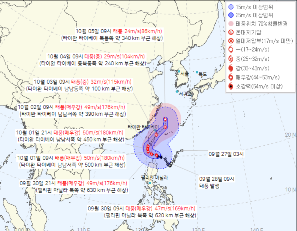 태풍은 10월 1일 국군의 날에 맞춰 중심 풍속이 초속 45m로 강해져 '매우 강한' 태풍으로 발달할 것으로 보입니다. 또한, 강풍 반경은 380㎞에 이를 것으로 예상됩니다.