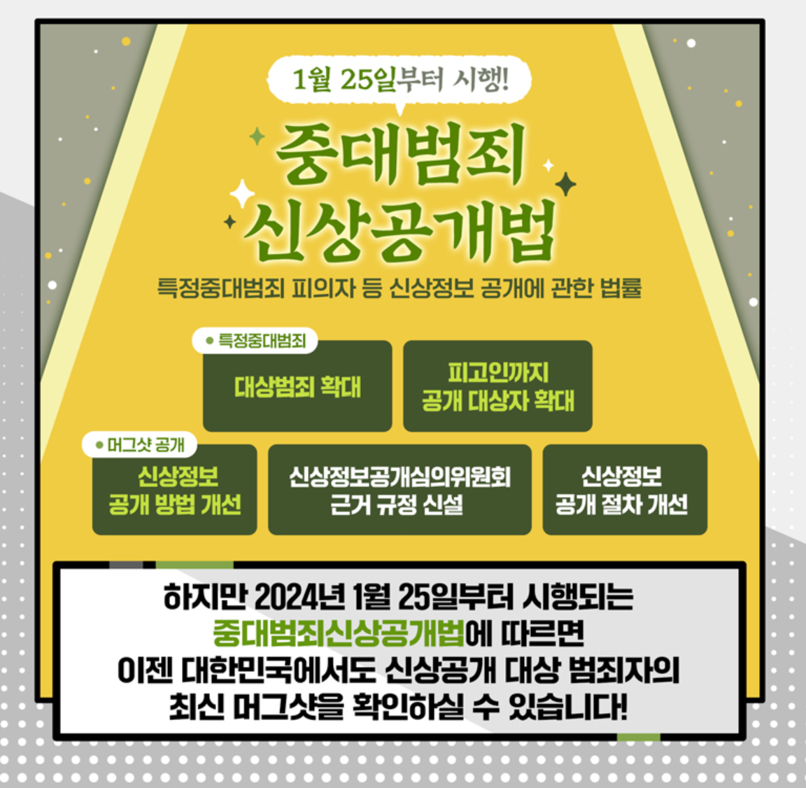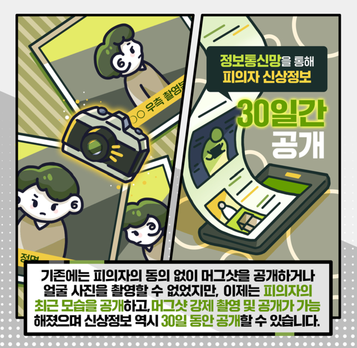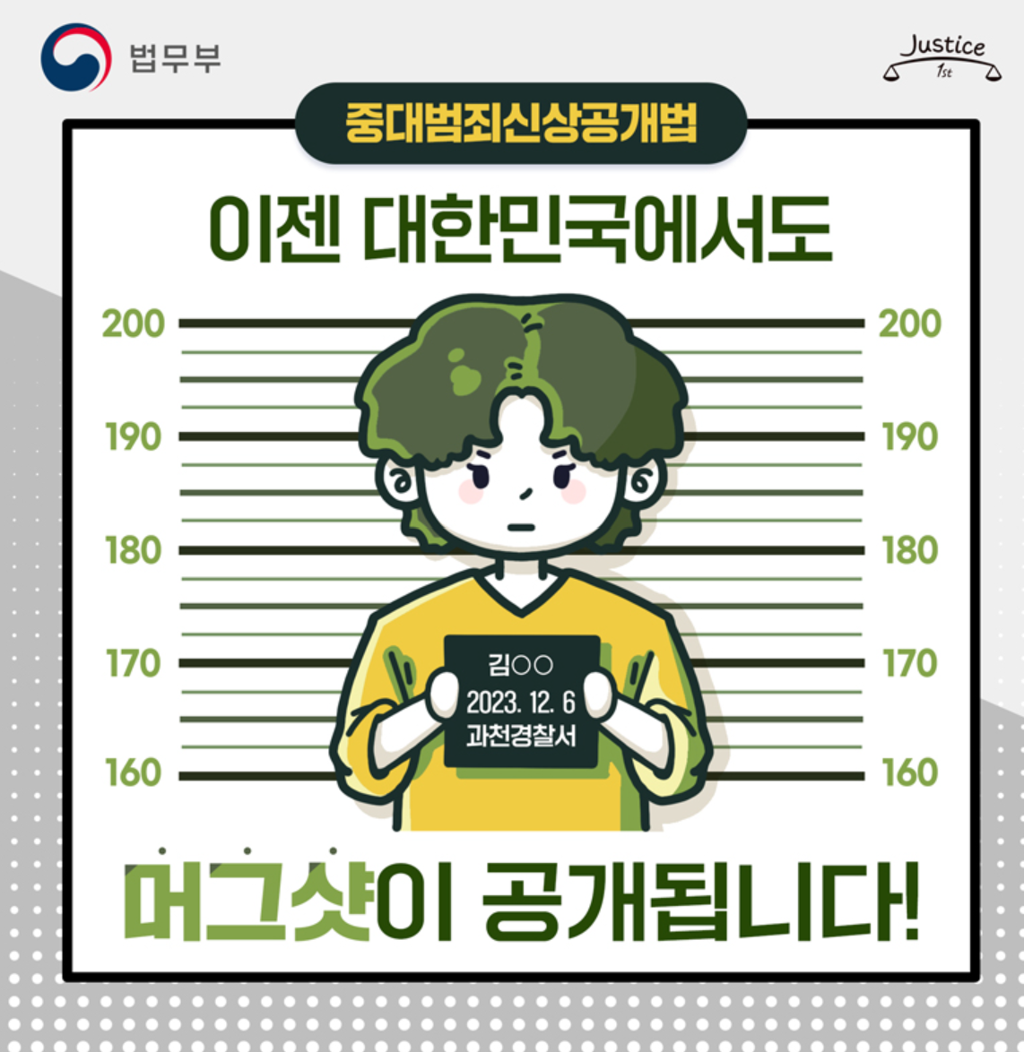 - 범죄 수사나 예방 목적으로 특정한 범죄자의 신상이 국민에게 공개될 수 있습니다. 이 경우 법률에 따라 수사기관이 언론에 범죄자의 신상 정보와 함께 머그샷을 제공할 수 있습니다.