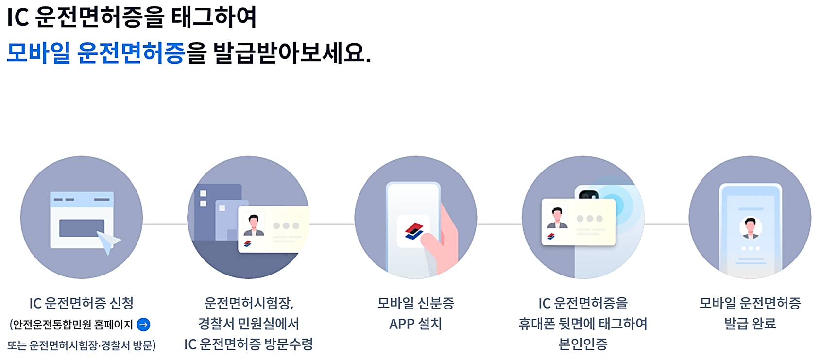 스마트폰에서 모바일 운전면허증 앱을 설치한 후 신청합니다. IC 칩이 포함된 운전면허증을 발급받으면, 스마트폰을 분실하거나 교체해도 다시 방문할 필요 없이 어디서나 재발급이 가능합니다. - 스마트폰 교체나 분실 시에도 IC 운전면허증을 활용해 간편하게 재발급 가능.