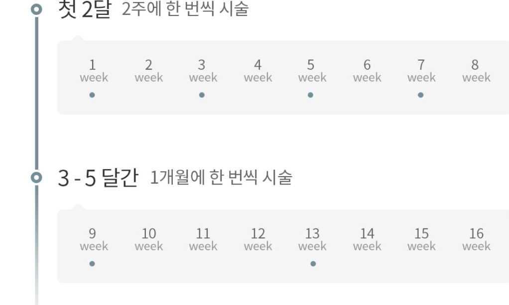 제모 간격은 첫 2달은 2주에 한 번씩 시술하고, 이후 3달에서 5달은 1개월에 한 번씩 시술하면 된다고 해요.